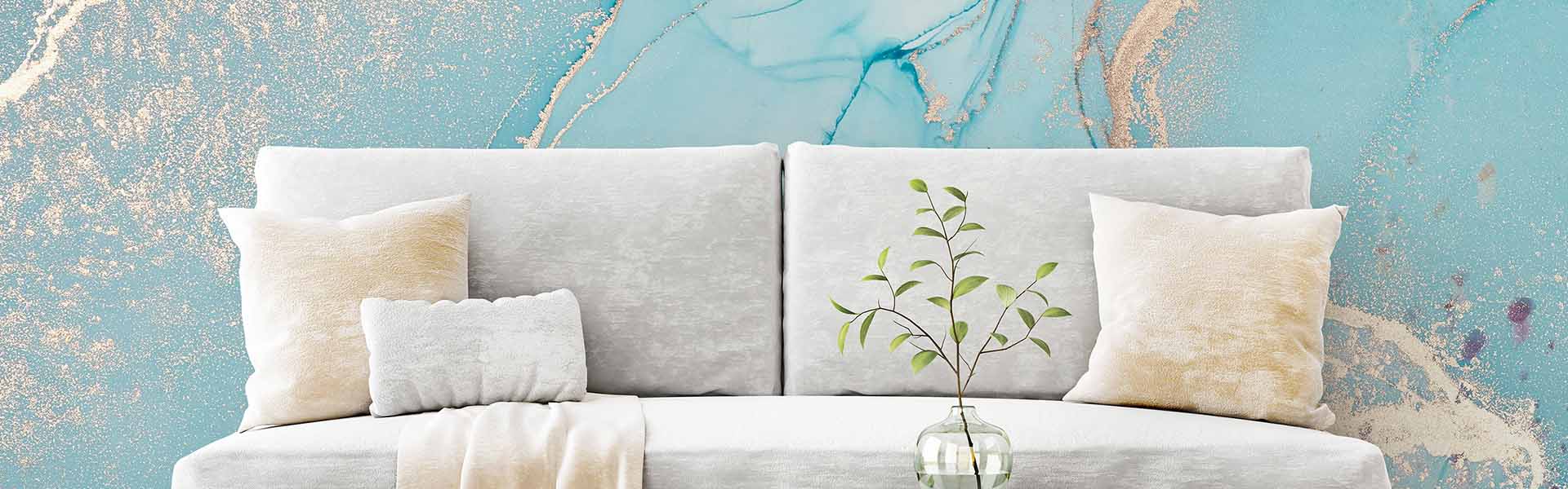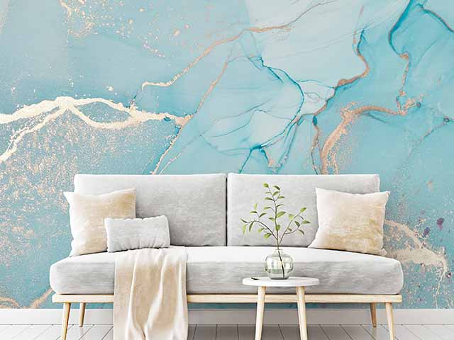 Be bold with your choices and go for something intricate like the marble trend. It becomes a beautiful statement of a living space or bedroom, and we love this watercolour blue offering.