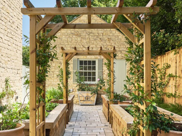 Climbing plants all work well on a pergola, with roses and clematis coming in as a firm favourite. If you don’t have room for a pergola, a slimmer wooden garden arch can work just as well.