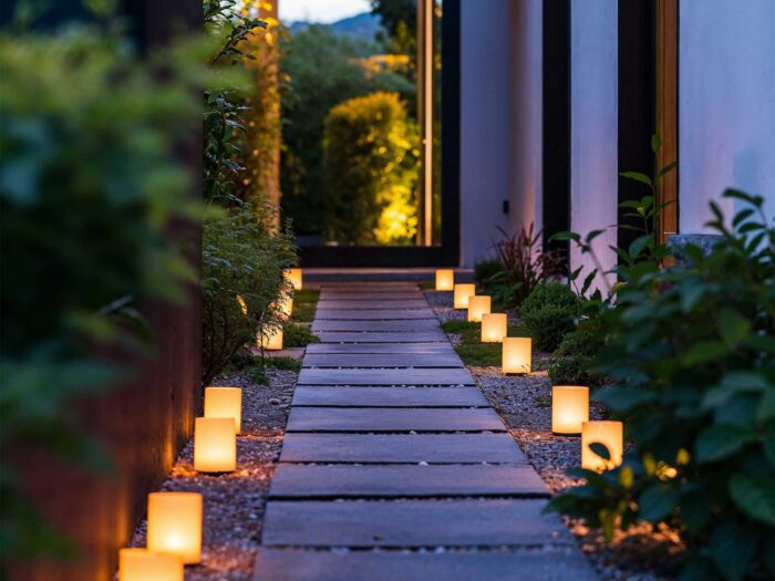 If you have a porch, that can be a great place to hang a few lanterns, or add some soft uplighters to the wall. Alternatively, landscaping your front garden path with a candlelit-style, solar-powered walkway will offer a romantic feel. Only use your outdoor lights when you need them though, to reduce the effects of ALAN (artificial light at night) on nocturnal wildlife.