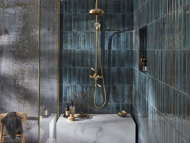 Pair dramatic dark tiles with striking brassware for a statement look – consider mixing contemporary metro tiles with a traditional-style shower head and exposed valves for further interest.