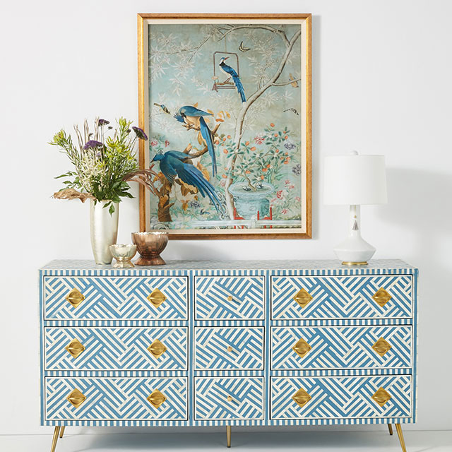 Investing in a really striking piece of furniture gives you the opportunity to go for something a little different; plus it’s an easier option for moving from room to room if you’re unable to change the walls or floor. Pictured below, this Optical Inlay nine-drawer sideboard is a great example of this (£2,498, Anthropologie).