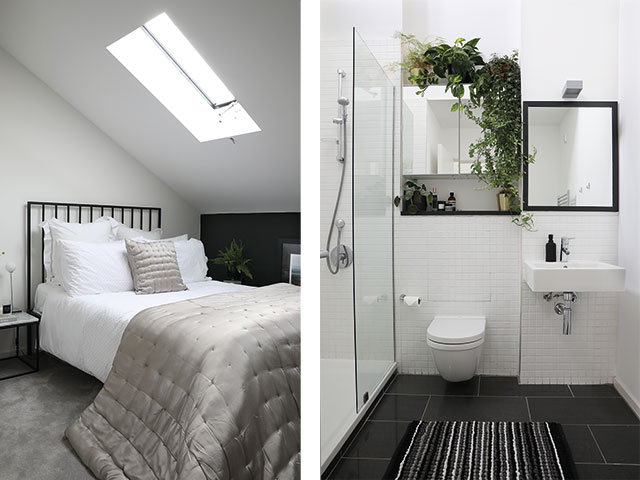 Left: Luana has had the Habitat metal bed in the guest room since she was a 19-year-old student. ‘I love their furniture,’ she says. ‘We live in a world of endless consumption, but I try to buy classic pieces that won’t date and keep them for a long time.’Right: Trailing plants bring verdant freshness and a softer element to the monochrome bathroom, which features wall-hung fittings to make the space feel bigger. Photos: Katie Lee