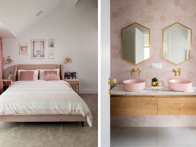 Left: Kate found the Liberty bed for her daughter’s room at DFS, the curtains are in a velvet fabric by Clarke & Clarke and the bedlinen and wall lights are from Next Home. Right: The elegant en suite features a vanity unit, taps and mirrors from Ribble Valley Bathrooms, teamed with Ca’ Pietra’s Medina Rosa hexagon wall tiles. Photos: David Giles