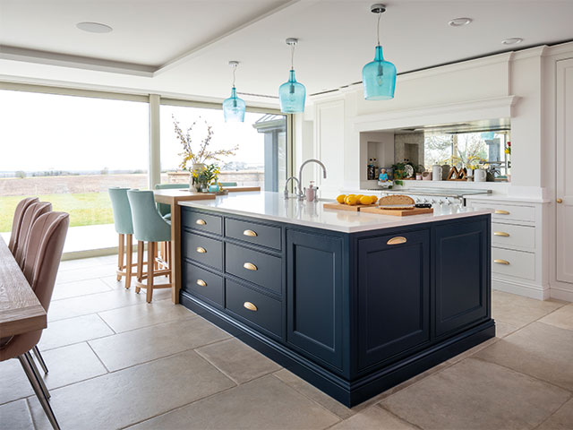 With its stunning views, this large open-plan space features stylish cabinetry by Willowfield Bespoke in three different colours. ‘I ordered pale blue custom-made stools by The Chair People for the breakfast bar, and chose aqua lights with a dimple effect above the island by Lights4Living,’ says Kate. Photo: David Giles