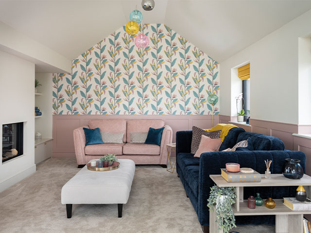 With an impressive vaulted ceiling, this separate space is nicknamed ‘the posh lounge’, with Kate choosing sofas in her favourite pink and blue from the Crystal range at Sofology. ‘The Llenya wallpaper in Blush Harbour Gold by Harlequin and the multi-coloured glass pendant by Lighting Styles really makes the most of the pitch’. Photo: David Giles