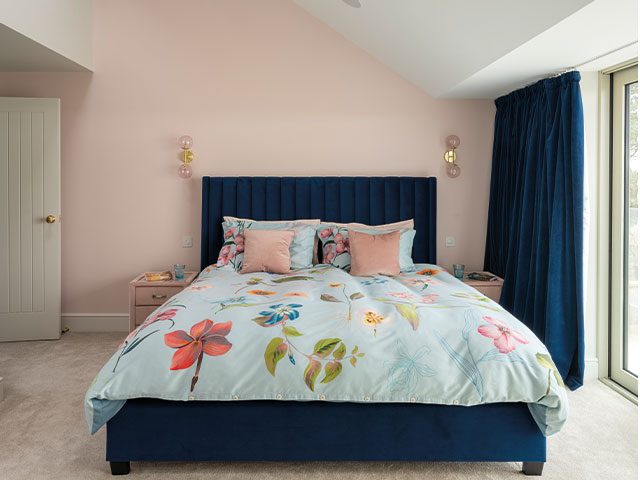 Little Greene’s Pink Slip adds a relaxing feel to the main bedroom. ‘I’ve brought some navy blue in with the Amalfi bed by Danetti, and the Clarke & Clarke velvet curtains and combined the colours with Hampton bedding by Ted Baker.’ Photo: David Giles