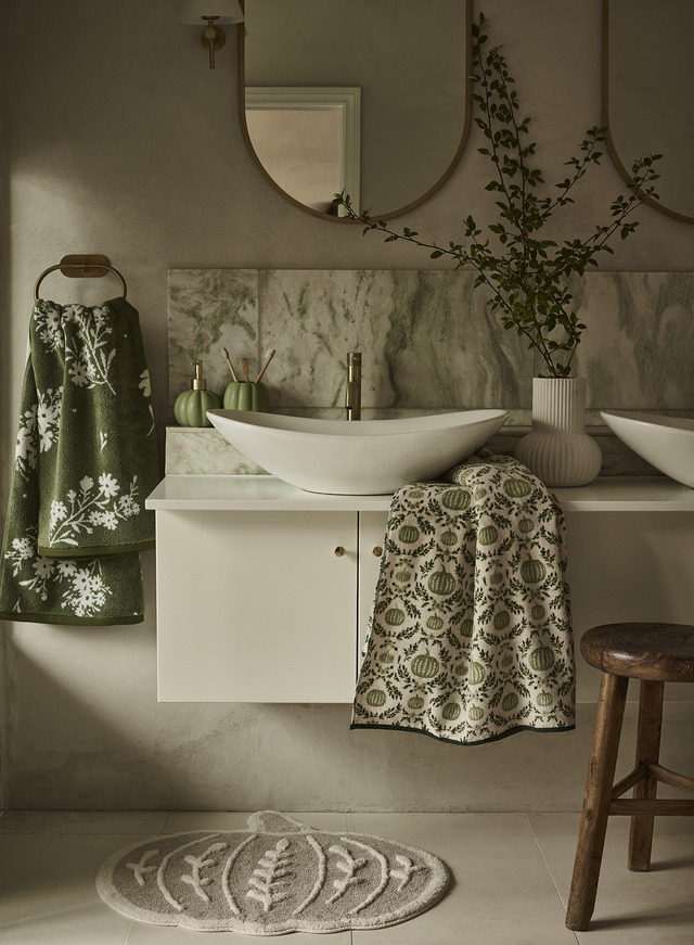 You don’t have to go overboard to make an impact. Think stylish towels with a nod to the season, shaped handwash dispensers and a bath mat with a festive spin.