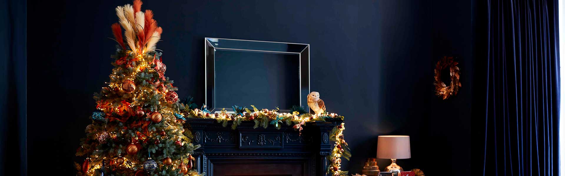6ft slim flocked tree, £49; Tropics paper fans, £8 for seven; Tropics paper onion decorations, £12 for four; Nordic Nomad round paper decorations, £13 for four; 20-inch hanging paper onion decorations, £15 each; Vivian bench seat, £209; Clara cotton velvet cushions, available in 23 colours, £20 each; walls painted in Luxe Navy matt emulsion, £16 per 2.5ltrs; tree decorations from a selection, all Dunelm