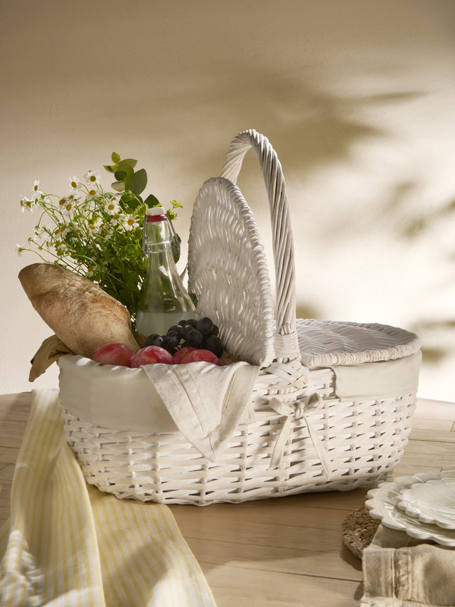 - Beige and white willow wicker picnic basket, £18 – buy here