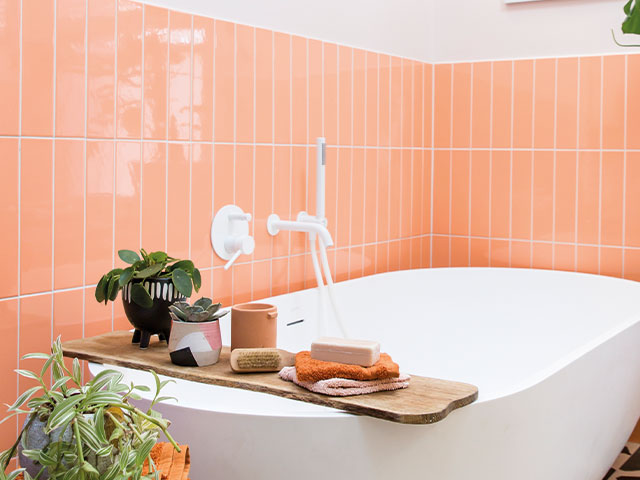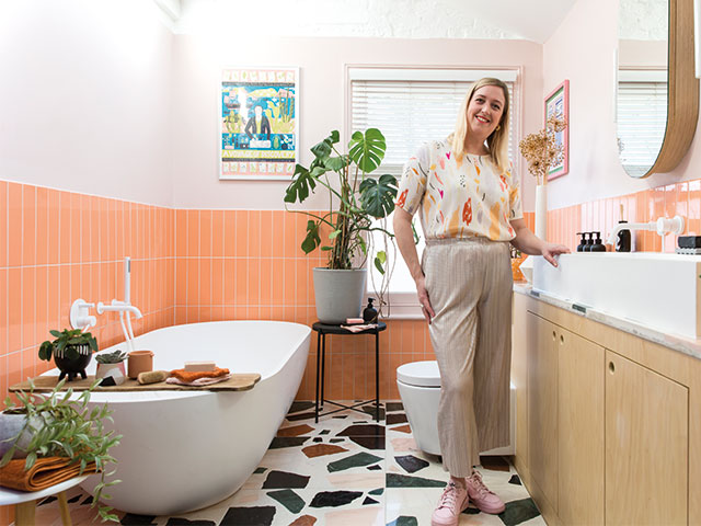 Lauren wanted to reflect her passion for colour and pattern. She based her design around Lusso Stone’s Picasso tub, adding pale coral tones on the walls, including YesColours’ environmentally friendly paint, and recycled marble and granite terrazzo floor tiles. Photo: Lizzie Orme