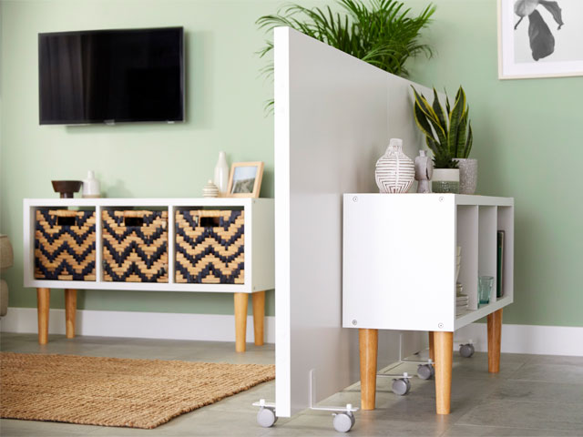 The Ikea Kallax unit is a great piece for experiments in furnitecture to divide up a flexible living space. Check out this video for great Ikea Kallax hacks and ideas: