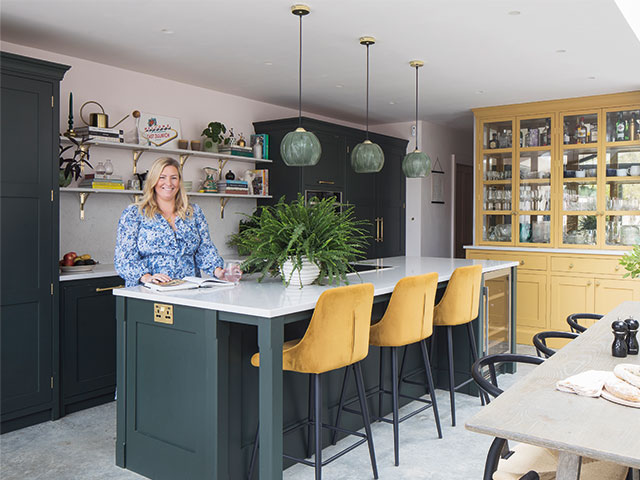 The couple wanted to make sure that the new space had an abundance of light and had a glass roof the length of the side return fitted. Choosing hardwearing polished concrete flooring underfoot, Isobel and Jeremy opted for beautiful Shaker-style cabinetry, which they painted dark green along with a custom-built dresser in a sunshine yellow. Photo: James French