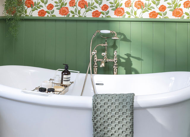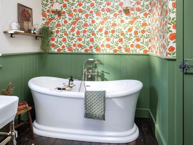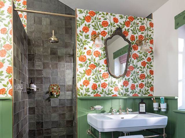 Because we have greens and blues running through the main part of the house, we wanted to create a visual connection, but it was tough choosing the right shade of green. We looked at lots of different tones, but this one – Farrow & Ball’s Calke Green – really stood out as it’s not too dark, but not wishy-washy either. A floral wallpaper above was always on the wish list, and again this roses design just leapt out at us.