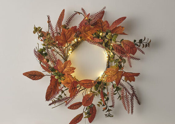 - 40cm Pre Lit Maple Lead Autumn Wreath, £39.99 from Lights4fun – buy here