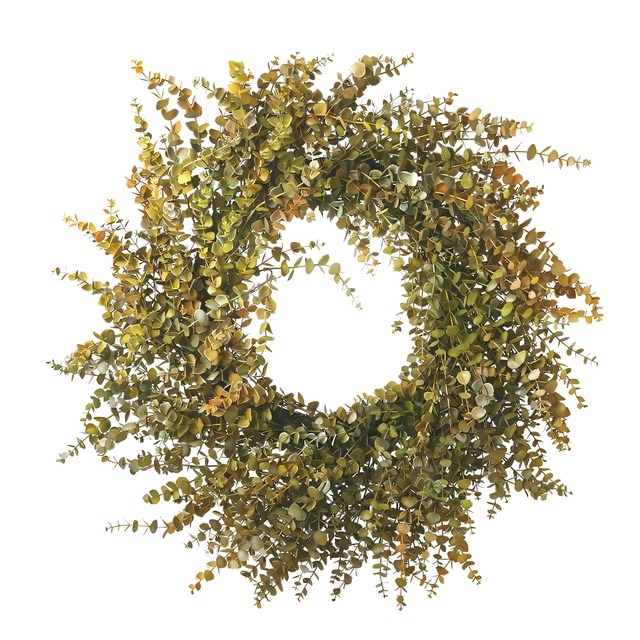 It’s crafted on a sturdy vine base and adorned with layers of richly hued autumn eucalyptus for a bold, elegant display on your door.